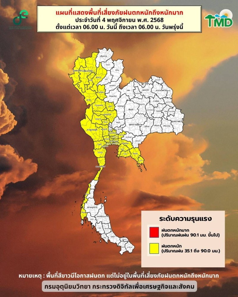 วันที่ 4 พ.ย. 2568 พยากรณ์อากาศ 24 ชั่วโมงข้างหน้า ประเทศไทยตอนบนจะมีฝนลดลงแต่ยังคงมีฝนตกหนักเกิดขึ้นได้บางพื้นที่ โดยเฉพาะจังหวัด กรุงเทพมหานครรวมทั้งปริมณฑล ฉะเชิงเทรา ชลบุรี ตาก กำแพงเพชร นครสวรรค์ อุทัยธานี ชัยนาท กาญจนบุรี สุพรรณบุรี และนครปฐม เนื่องจากร่องมรสุมกำลังแรงพาดผ่านภาคกลาง และภาคตะวันออกเข้าสู่หย่อมความกดอากาศต่ำบริเวณชายฝั่งประเทศเวียดนามตอนกลาง ในขณะที่บริเวณความกดอากาศสูงหรือมวลอากาศเย็นกำลังปานกลางจากประเทศจีนได้เคลื่อนเข้าปกคลุมภาคตะวันออกเฉียงเหนือ ทำให้บริเวณดังกล่าวจะมีอุณหภูมิลดลงกับมีอากาศเย็นในตอนเช้า ขอให้เกษตรกรเตรียมการป้องกันและระวังความเสียหายที่จะเกิดต่อผลผลิตทางการเกษตร รวมทั้งดูแลรักษาสุขภาพเนื่องจากสภาพอากาศที่เปลี่ยนแปลง และเพิ่มความระมัดระวังในการสัญจรผ่านบริเวณที่มีฝนตก รวมถึงระวังอันตรายจากฝนตกหนักซึ่งอาจทำให้เกิดน้ำท่วมได้ในบางพื้นที่