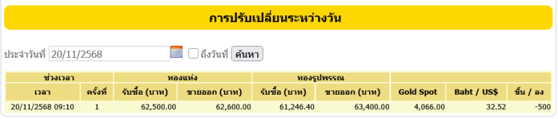 ราคาทองคำ วันที่ 20 พฤศจิกายน 2568