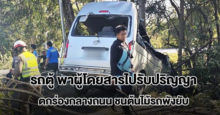 รถตู้ พาผู้โดยสารไปรับปริญญา คนขับวูบหลับใน ตกร่องกลางถนน ชนต้นไม้รถพังยับ เจ็บระนาว
